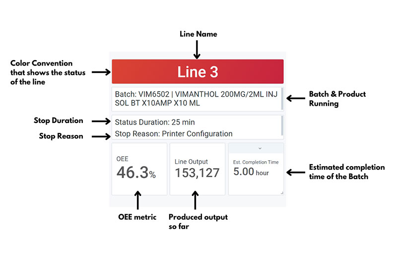 - Color Convention – An indicator of the current status of the line using the red color code, which indicates that it is currently stopped. A green color code would indicate the production is running at a nominal speed, and a yellow color would indicate production is currently running with speed losses.